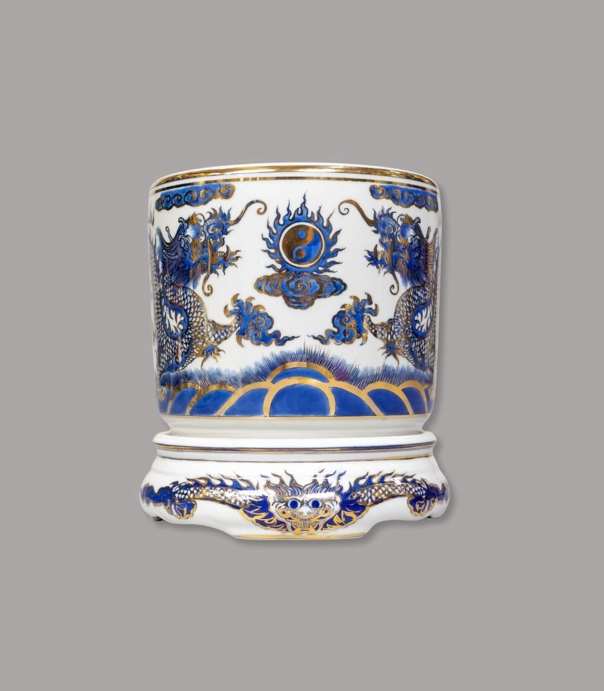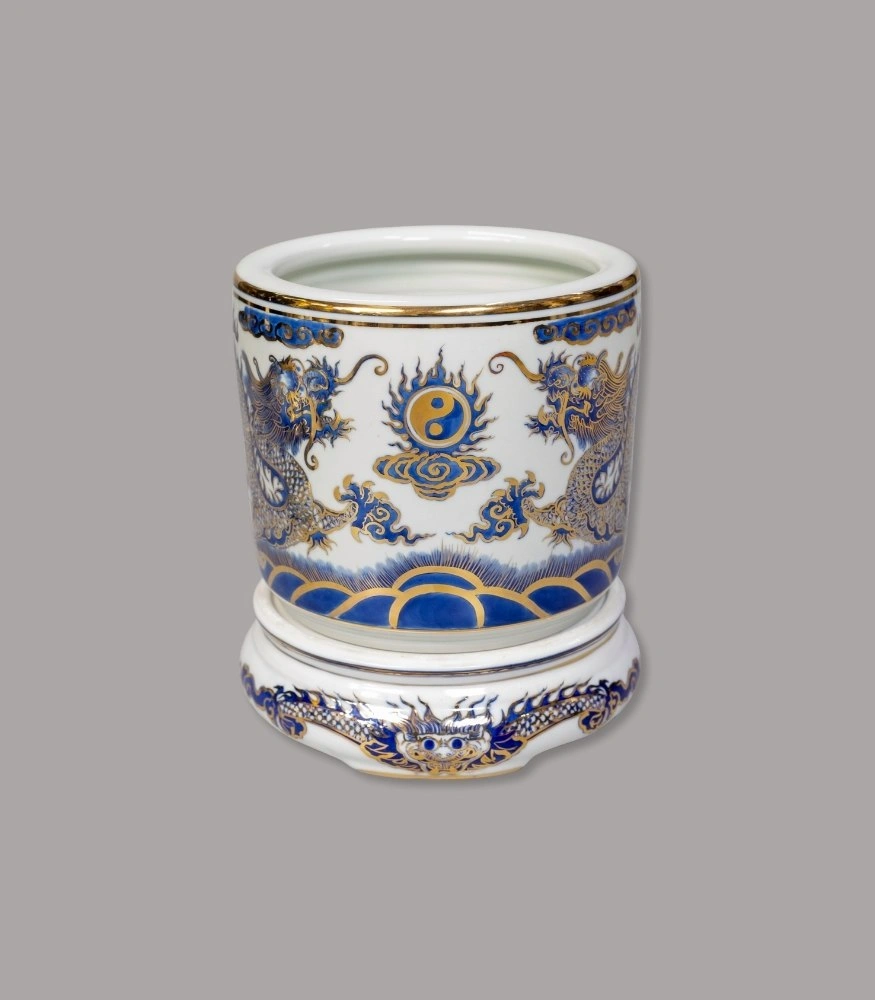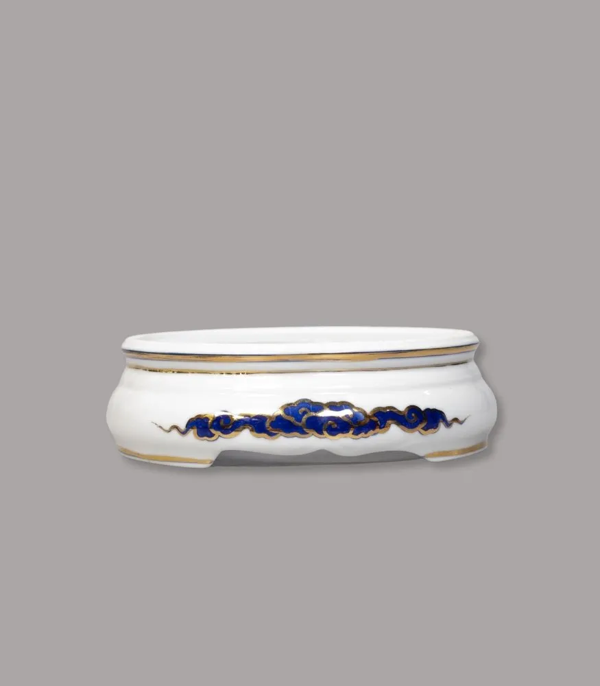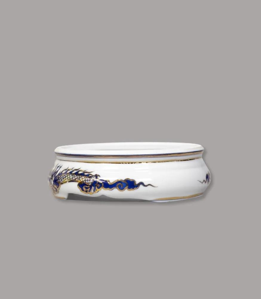 Đế sứ họa tiết rồng men lam vẽ vàng của Gốm Chín Bát Tràng được làm thủ công, vẽ tay lam cobalt điểm vàng tinh xảo. Phụ kiện giúp kê bát hương, chóe, mâm bồng…, vừa tôn dáng – chống xước mặt bàn thờ vừa tăng vẻ trang trọng, đồng bộ phong cách men lam vẽ vàng.
