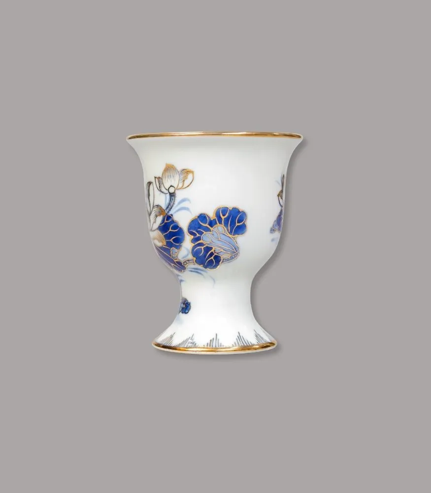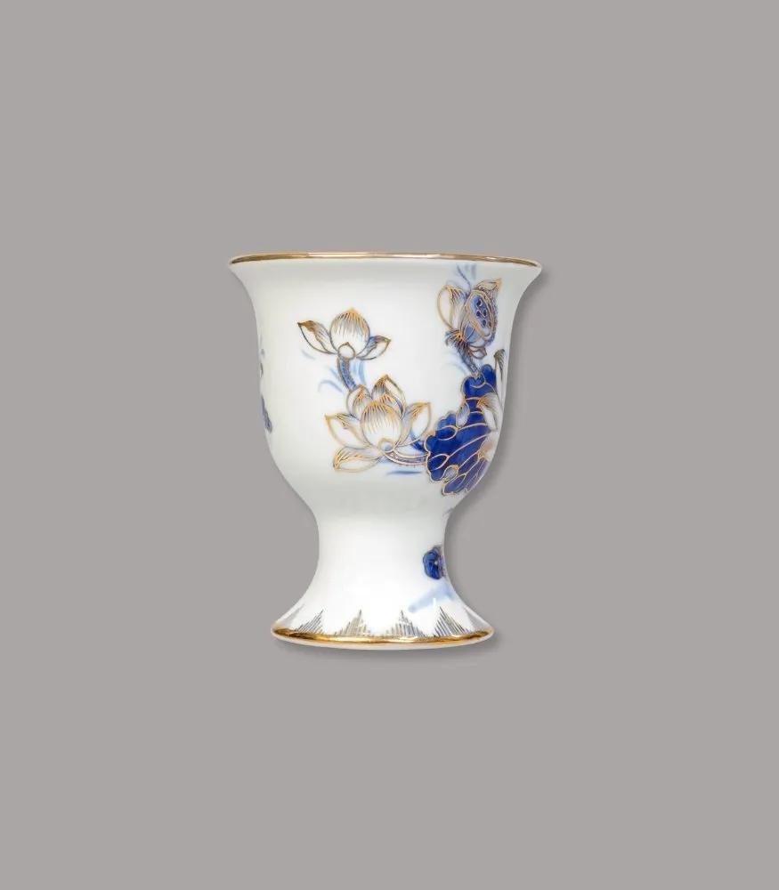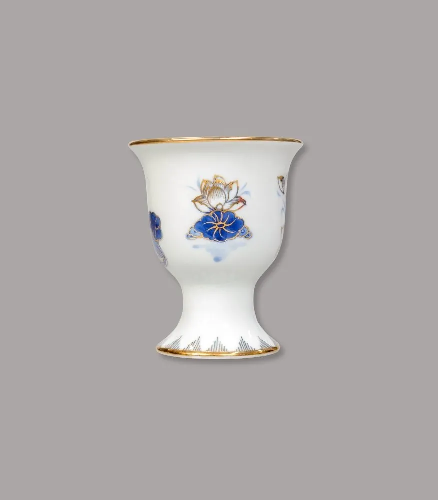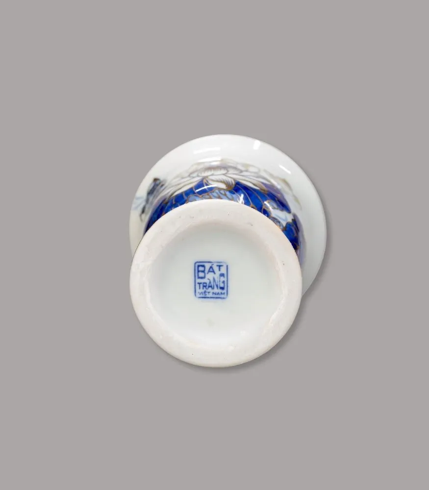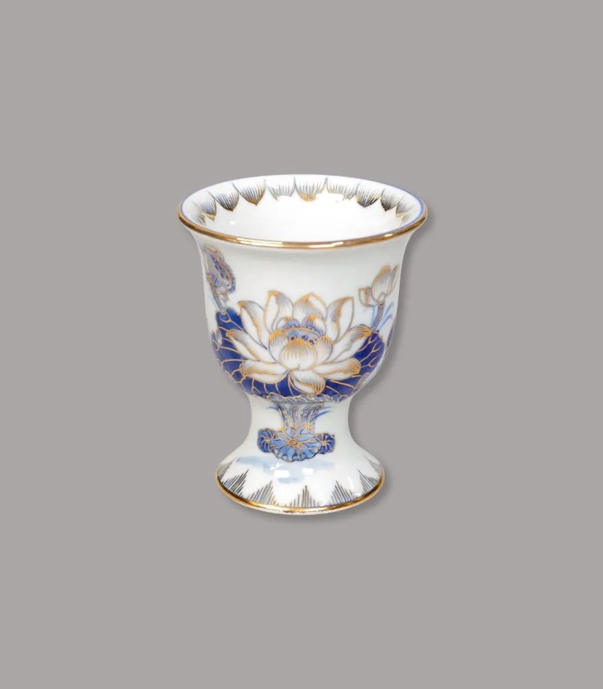 Ly Phật thủ men lam vẽ vàng của Gốm Chín Bát Tràng được chế tác thủ công, dáng cốc miệng loe – chân đế vững, họa tiết liên hoa lam cobalt điểm vàng tinh xảo. Sản phẩm chuyên dùng dâng nước thanh tịnh, làm sáng và trang nghiêm không gian thờ tự.